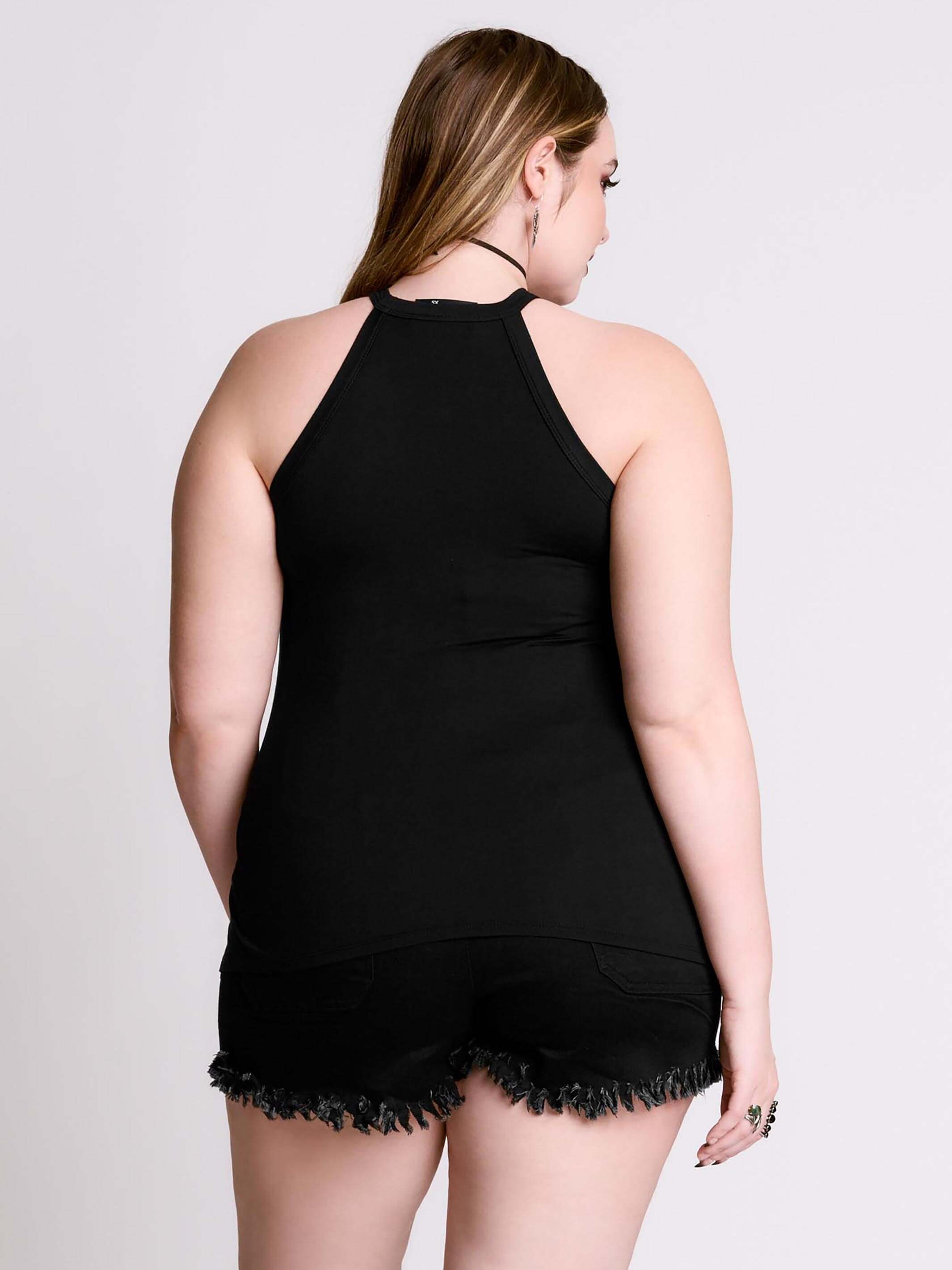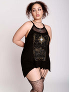 Custom star tarot art on a super soft and flowy jersey tank with mesh detail. 95% rayon, 5% spandex. Fishnet yoke contrast 100% polyester