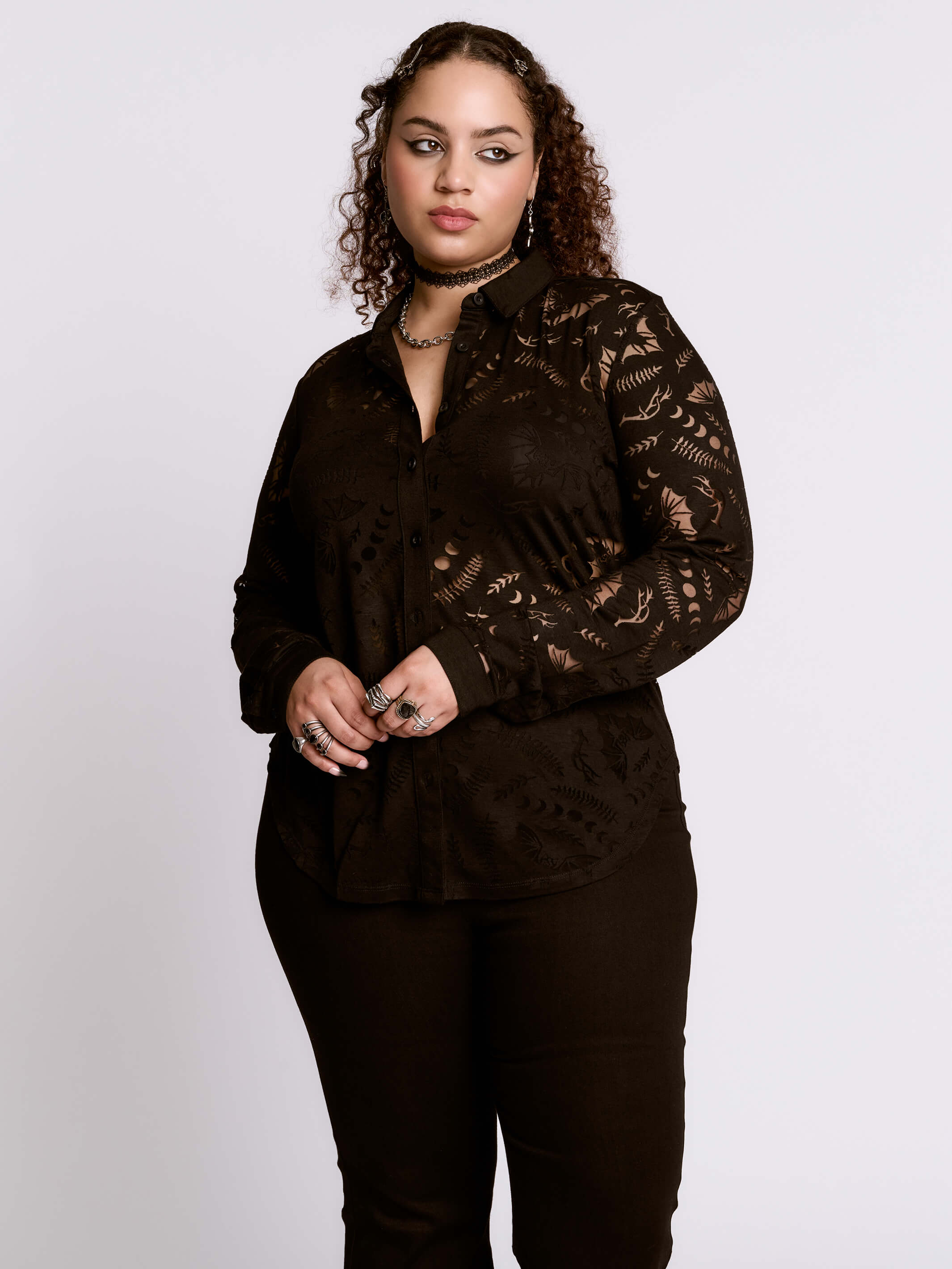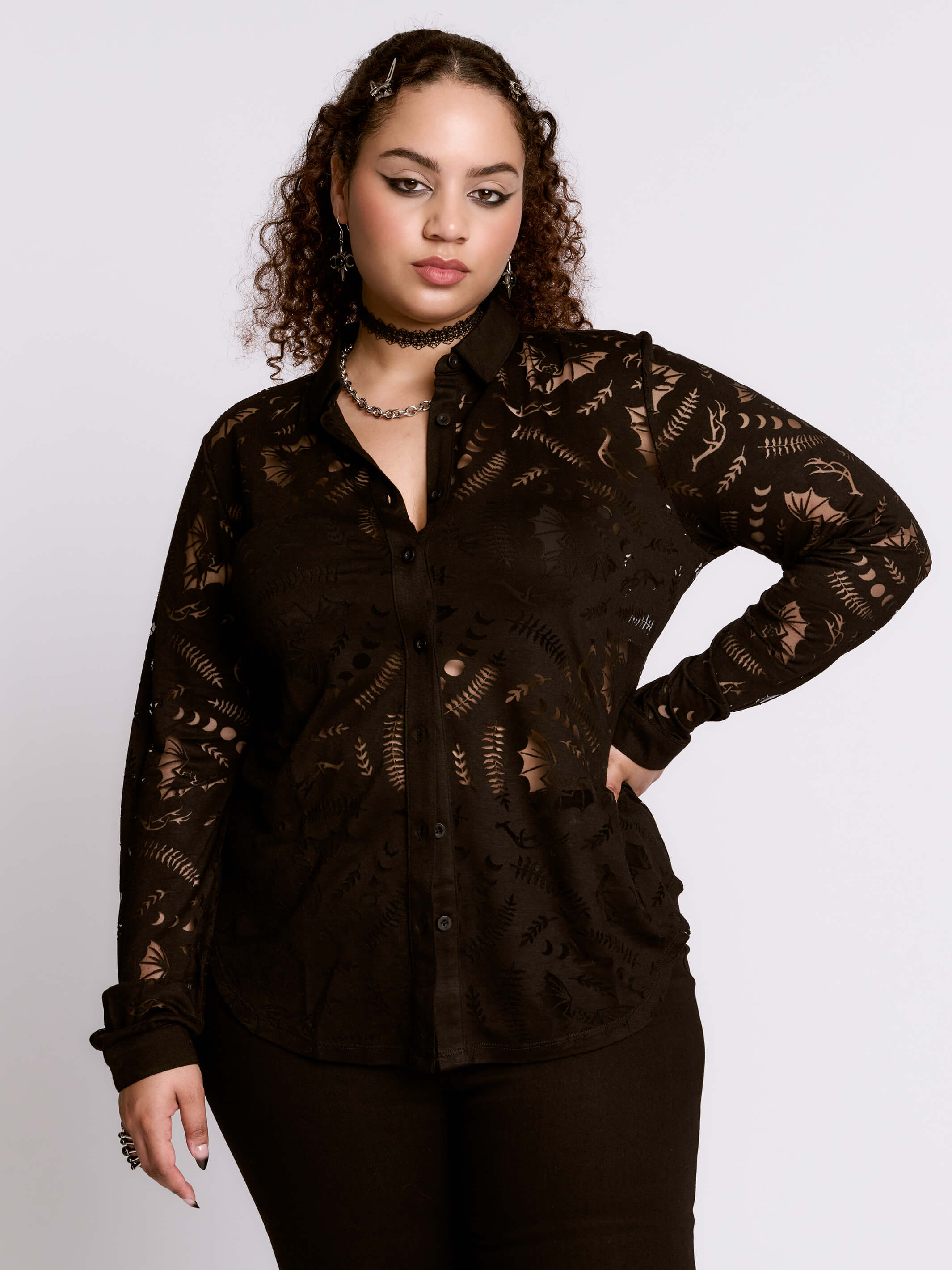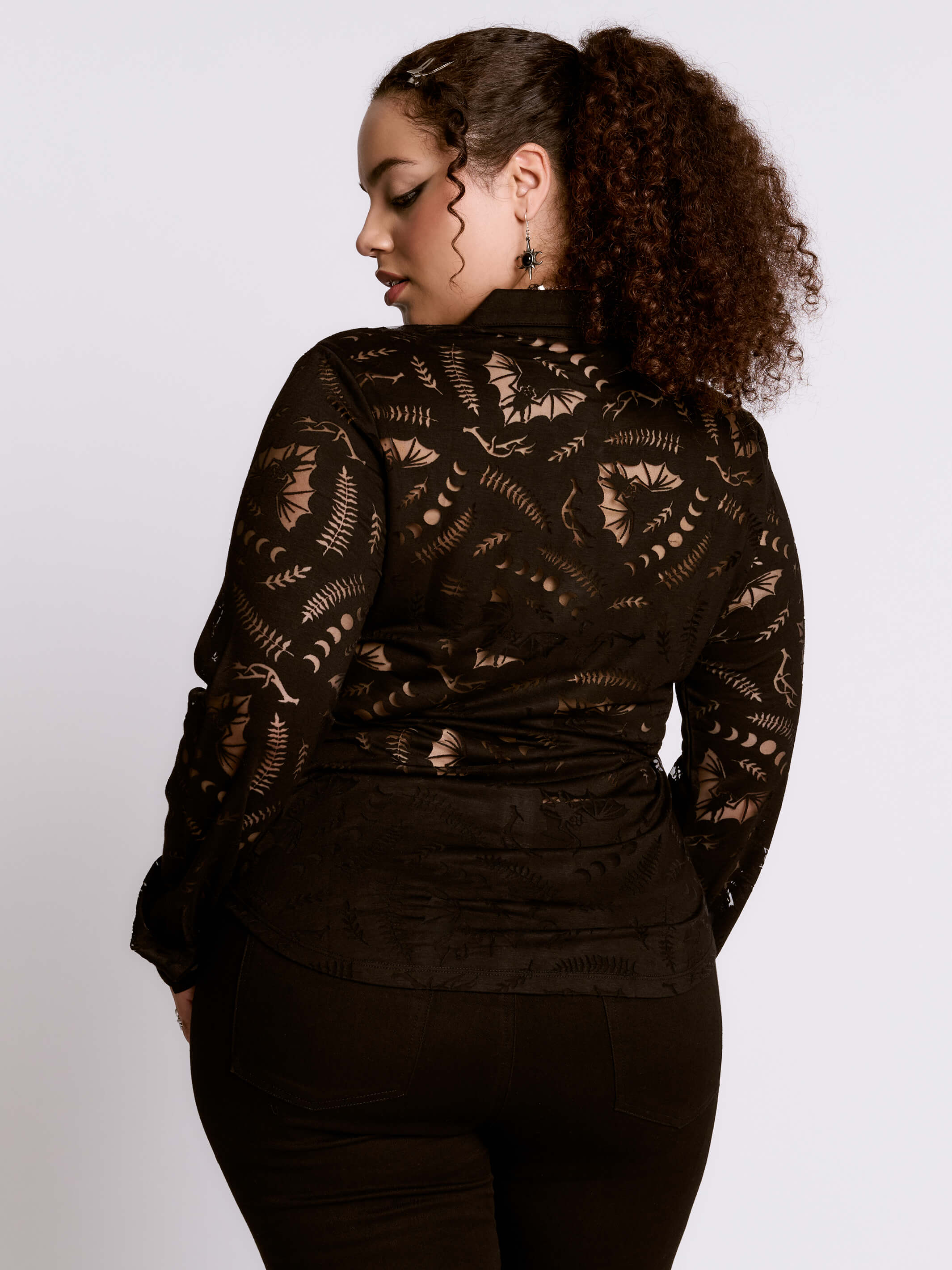 Button up collard shirt with single button cuff featuring our scorned bats burnout fabric.