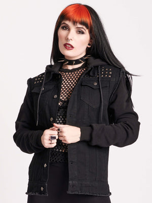 Studded and washed denim jacket with french terry hood & sleeves. Denim 100% Cotton. Sleeves & Hood 56% Cotton, 44% Polyester. Antique nickel pyramid studs on front and back shoulders. Styled with our fishnet top.