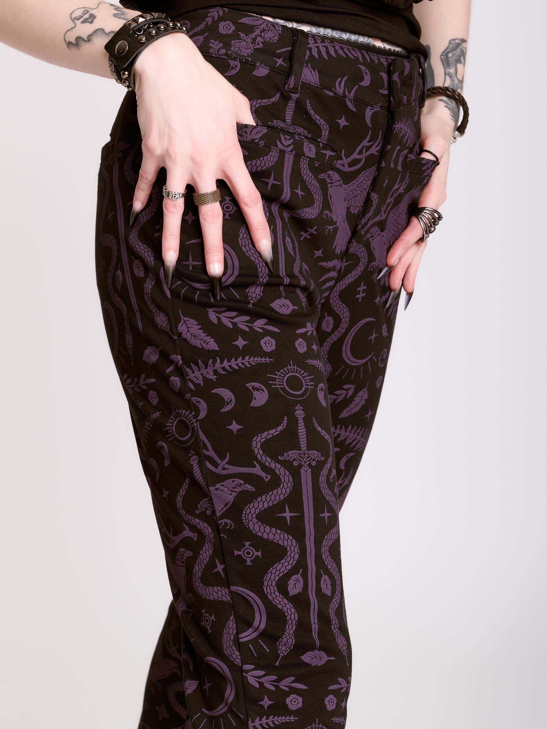 Featuring a  custom crescent moon zipper detail, side pockets, and a hidden side zipper.