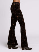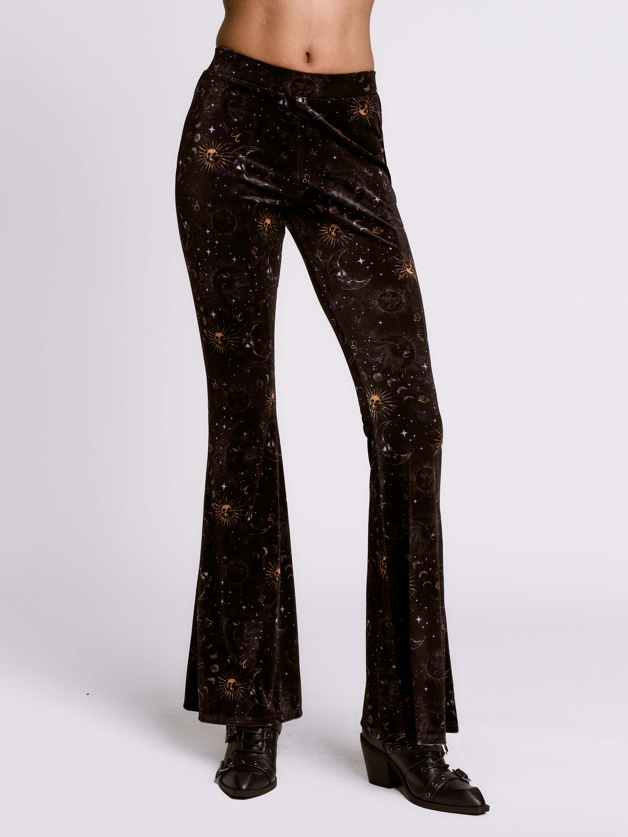 Vamp up your fit! Stretch velvet flared leggings in celestial printed velvet. Pair these elegant and alluring flares with your best platforms for mile high legs! Elastic waistband.