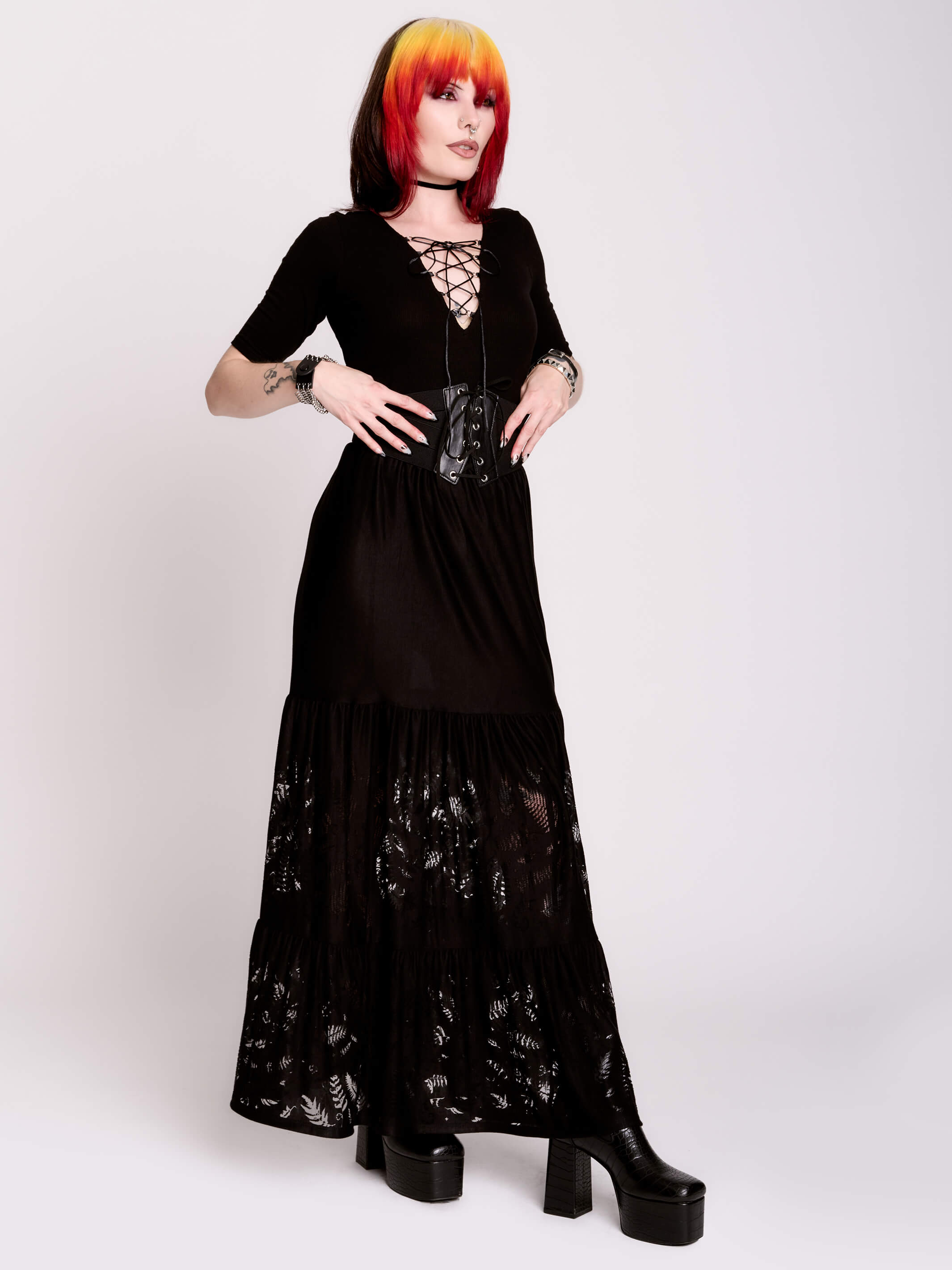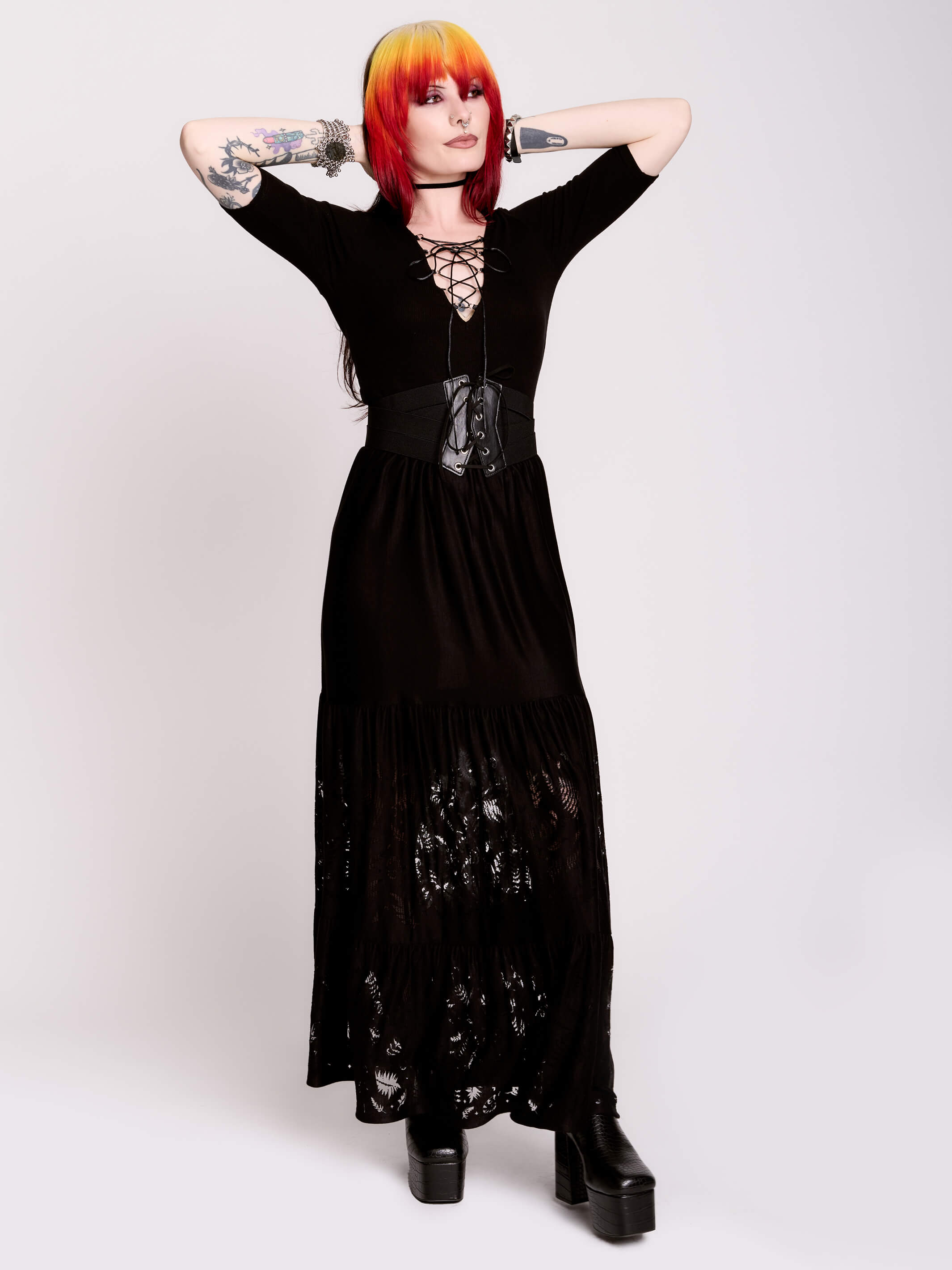 The model with red and black hair is 5'3" wearing a XS. The other model is 5'10" wearing a size XL. Styled with our Spellbound Boots, Fishnet Garter Tights and Laced Corset Belt (sold separately).
