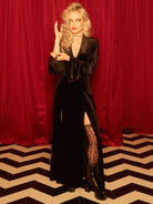 Stretch velvet dress featuring a deep v-neck, double front slits and bell sleeves. 92% polyester 8% spandex.