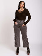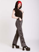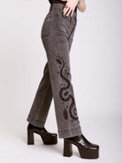 Denim cropped high-waisted wide-leg jeans are made with the softest denim and flattering high rise fit. These will become your new go to pant. Distressed mineral wash & embroidered snake down the legs.