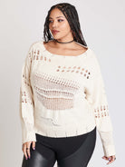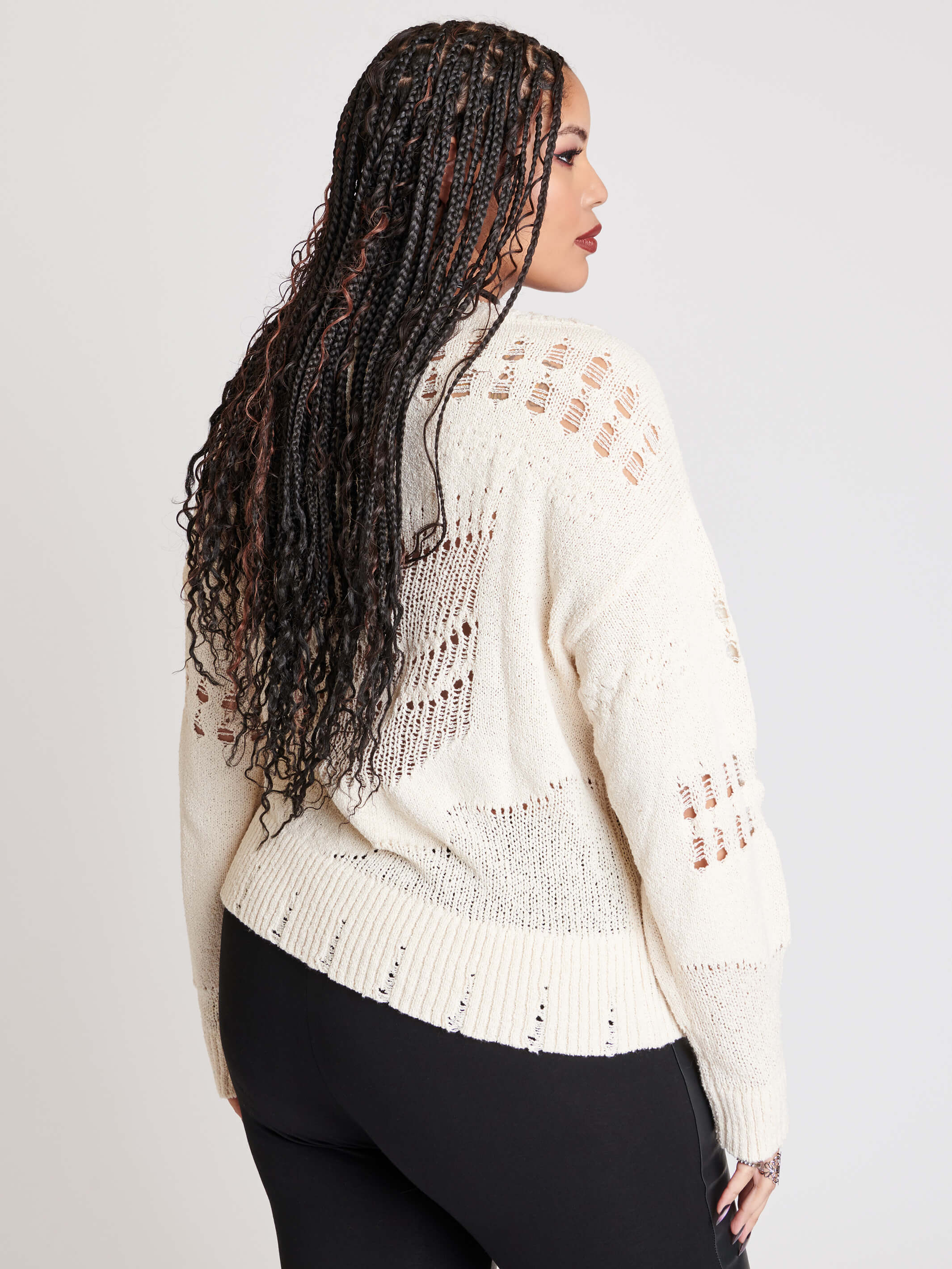 This sweater has a knit construction with all over distressed details and a slouchy oversized fit.