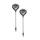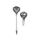 A pair of miniature pewter heart ear studs within a delicate frame and pierced at its center, with a pewter nail on a fine chain to stick into the vacant hole and surgical steel ear post.