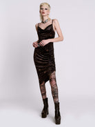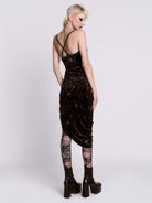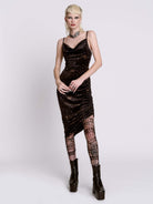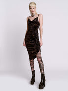 Slink into the night with this super soft & stretchy printed velvet cocktail dress. Cowl draped neckline, adjustable straps, asymmetrical hemline with shirred side. Constructed with a heavy stretch velvet. 92% Polyester, 8% Spandex.