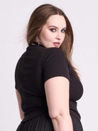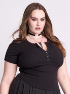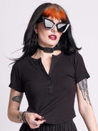 Short sleeve ribbed body Henley top with curved hemline. The perfect, figure flattering, basic black top!