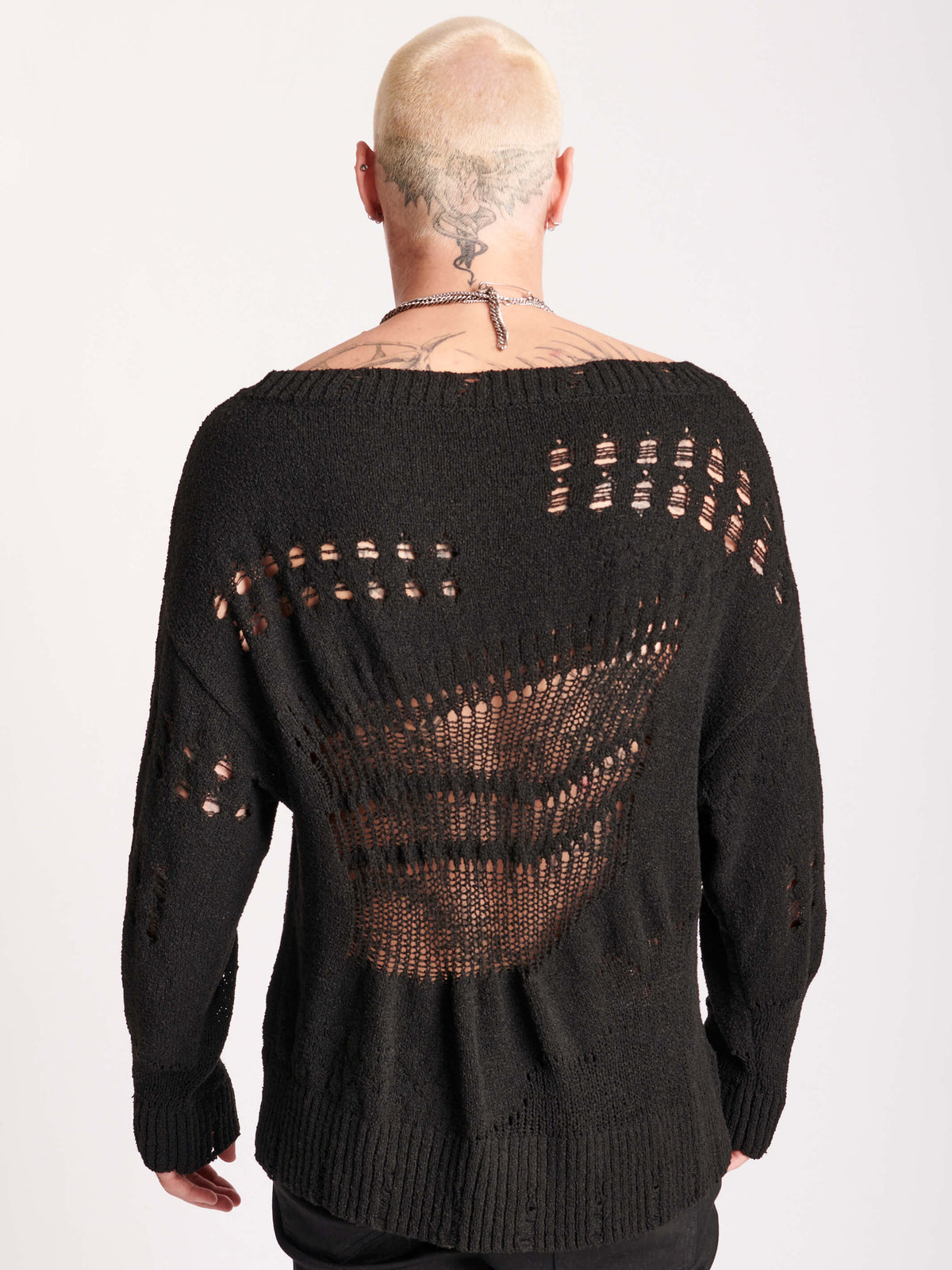Feeling destructive? This sweater has a knit construction with all over distress details and a slouchy fit.