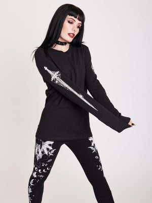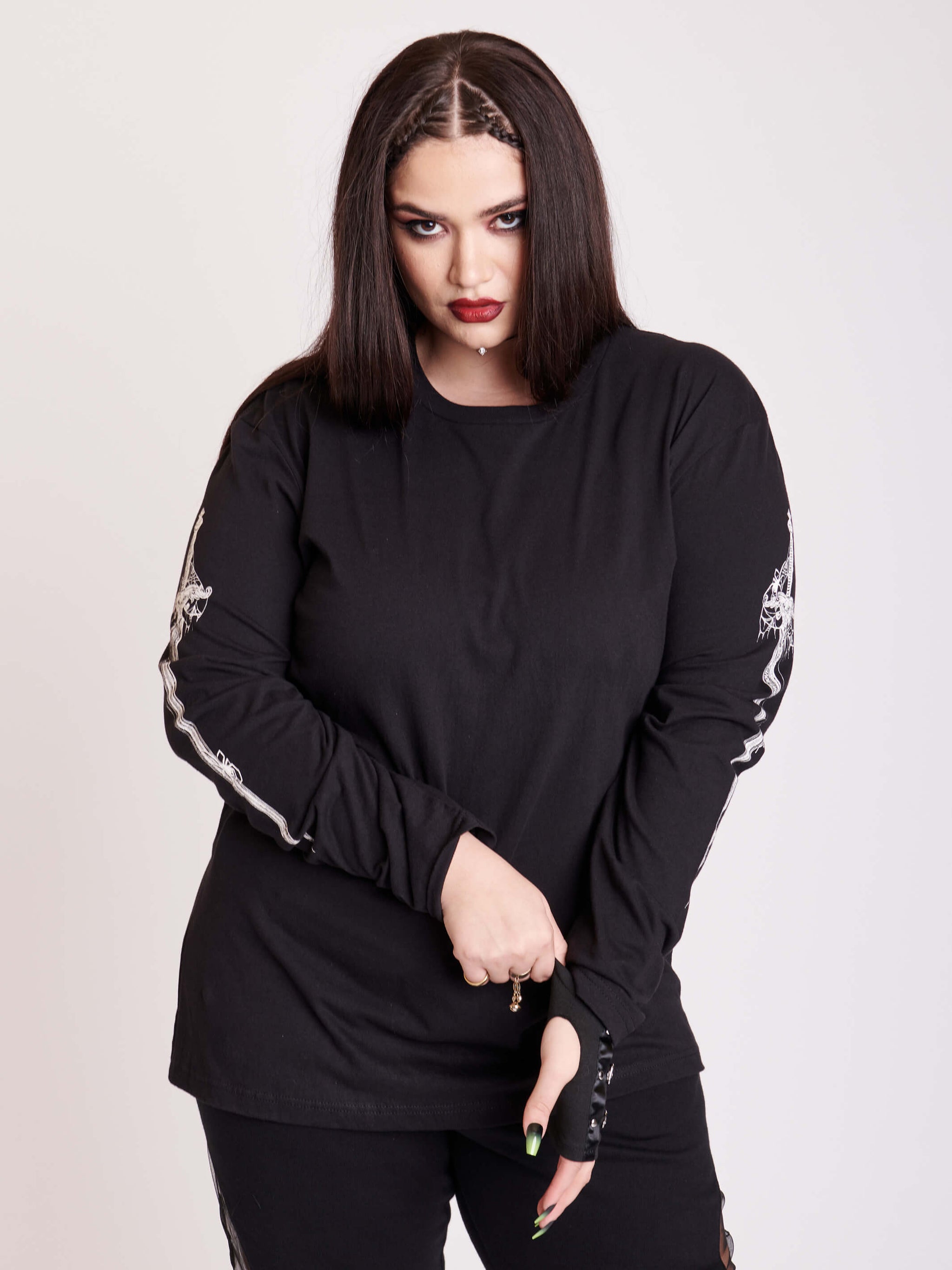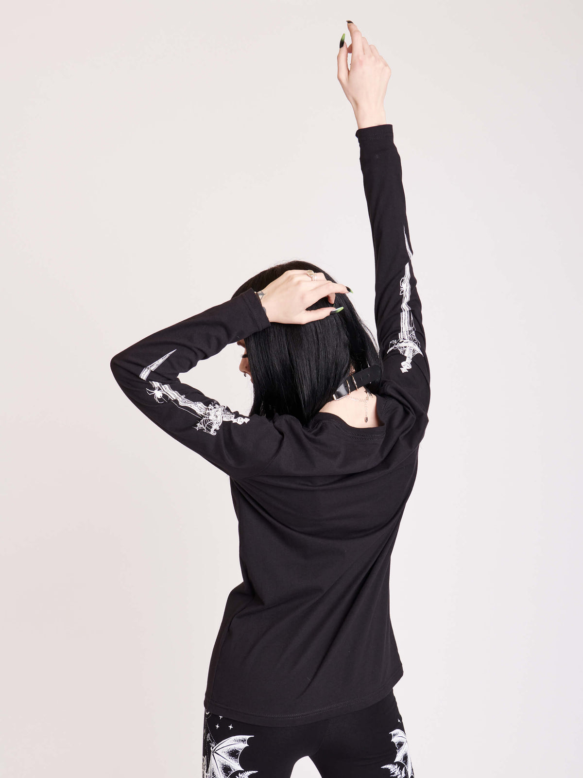 Attack the night in this 100% cotton unisex fit(men's size chart) long sleeve shirt, featuring our original spider dagger design on each sleeve.