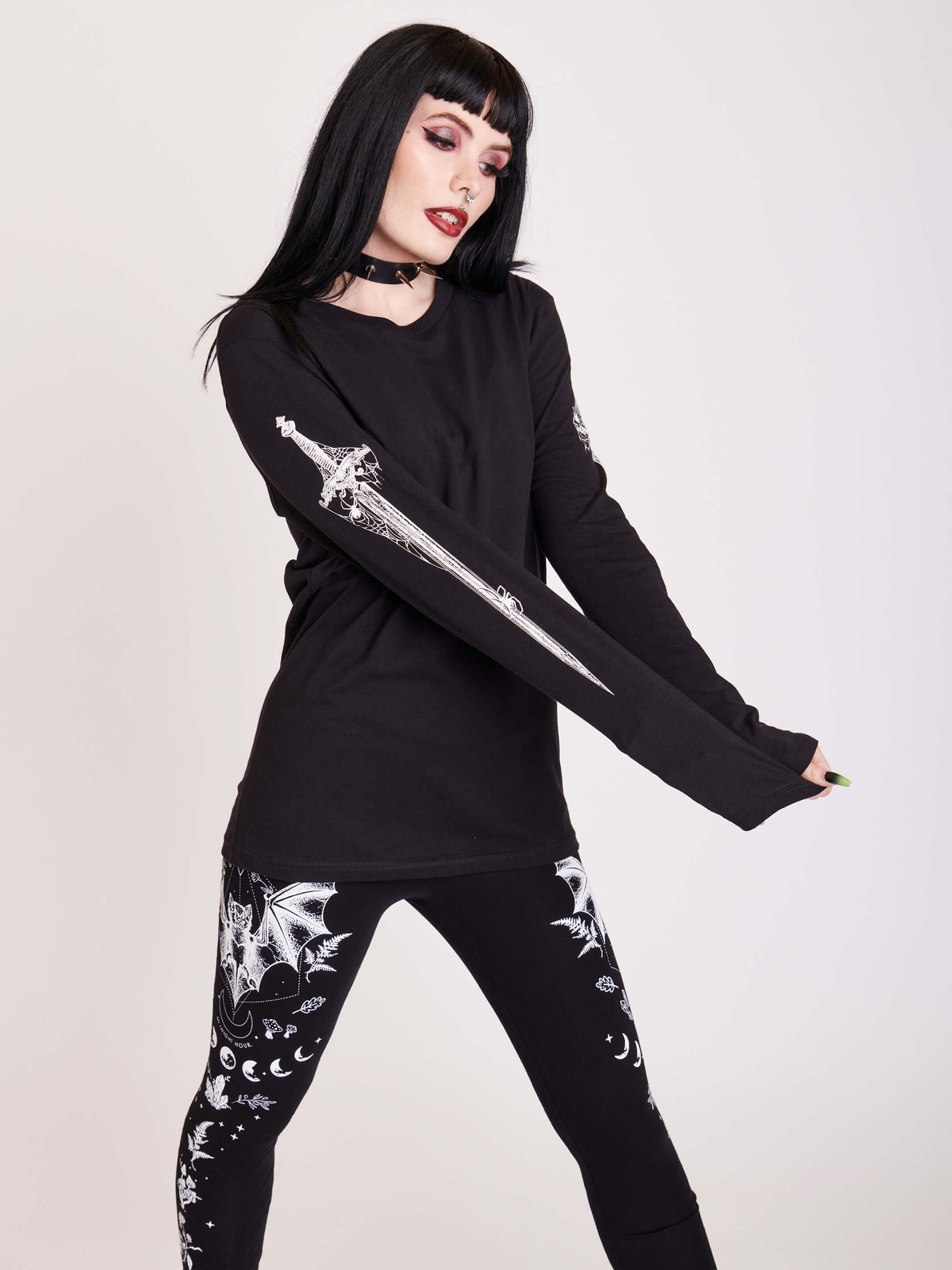 Dagger graphic on a unisex fit long sleeve t-shirt. Men's & women's sizing is the same.