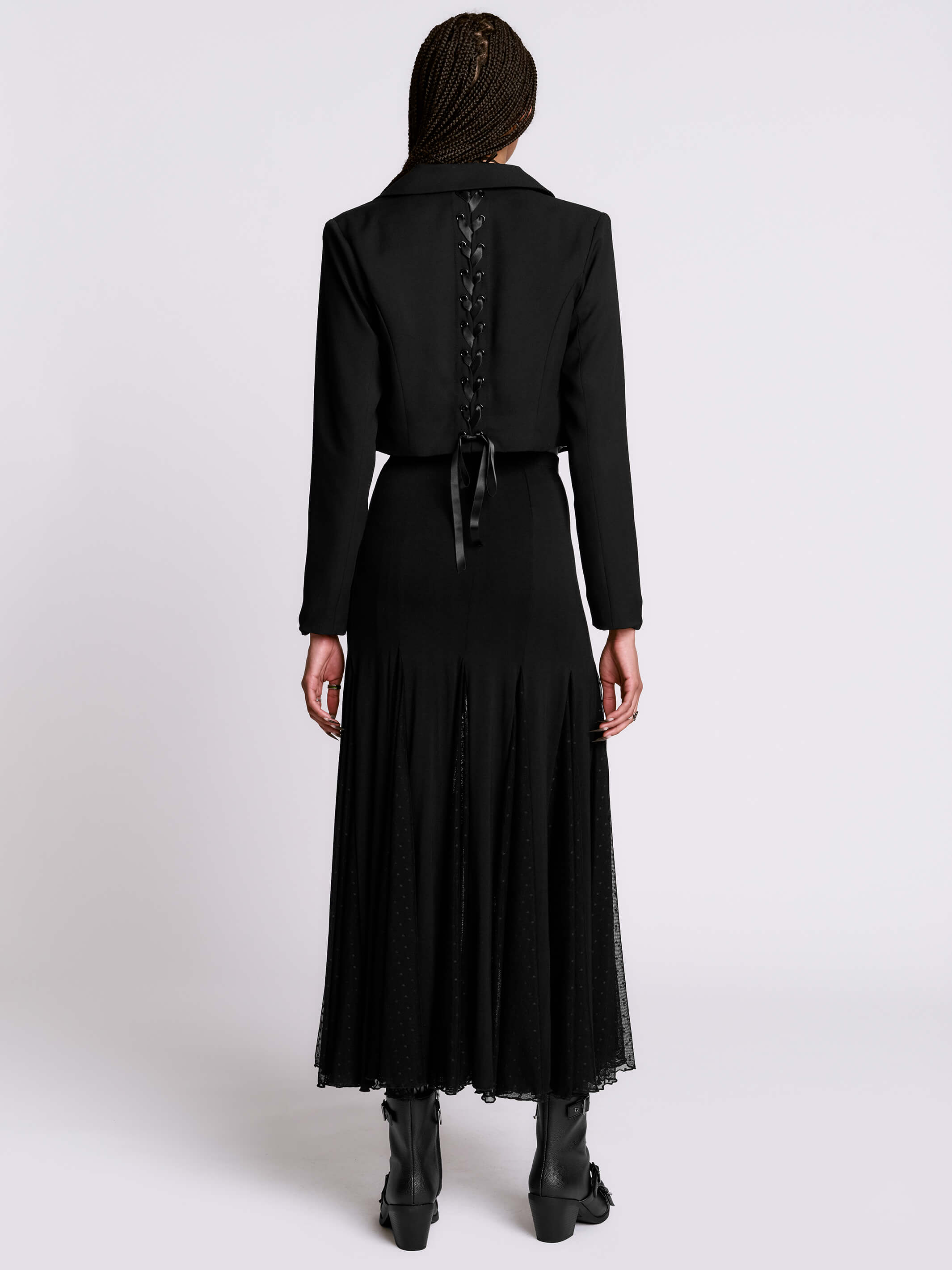 Classic blazer with a cropped fit and lace up satin back detail and lined with our custom Sword Of Mercy print.