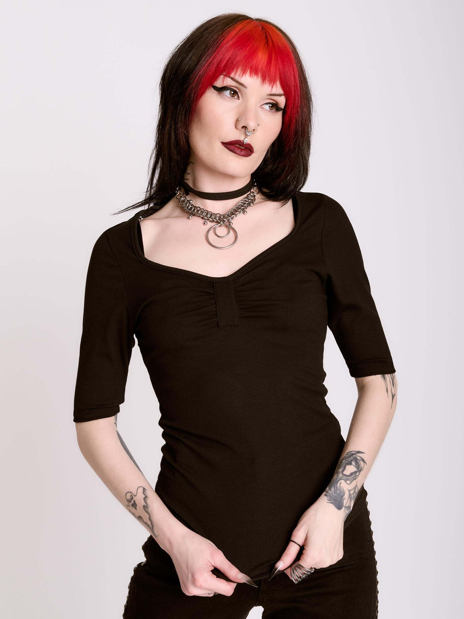 Our best selling sweetheart top silhouette with an added bat bonus! Soft & flattering rib jersey made of 76% Polyester, 15% Rayon, 9% Spandex. Length approximately 24" long.